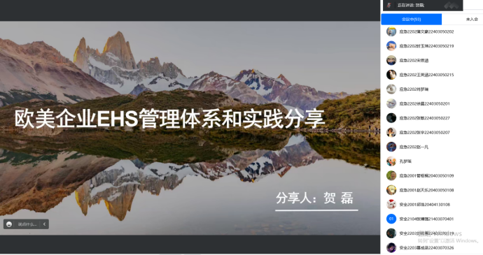 2022年11月26日晚,91在线 安全工程系依托西部安全工程虚拟教研室,与学校安全协会联合举办“安全工程学术沙龙”第三期讲座。本次沙龙由安全工程系主任王莉主持。美光科技-美光半导体(西安)有限公司EHS高级工程师贺磊受邀就欧美企业EHS管理体系和实践,对91在线 学生进行在线辅导。91在线 120余名本科生参与了本次沙龙。