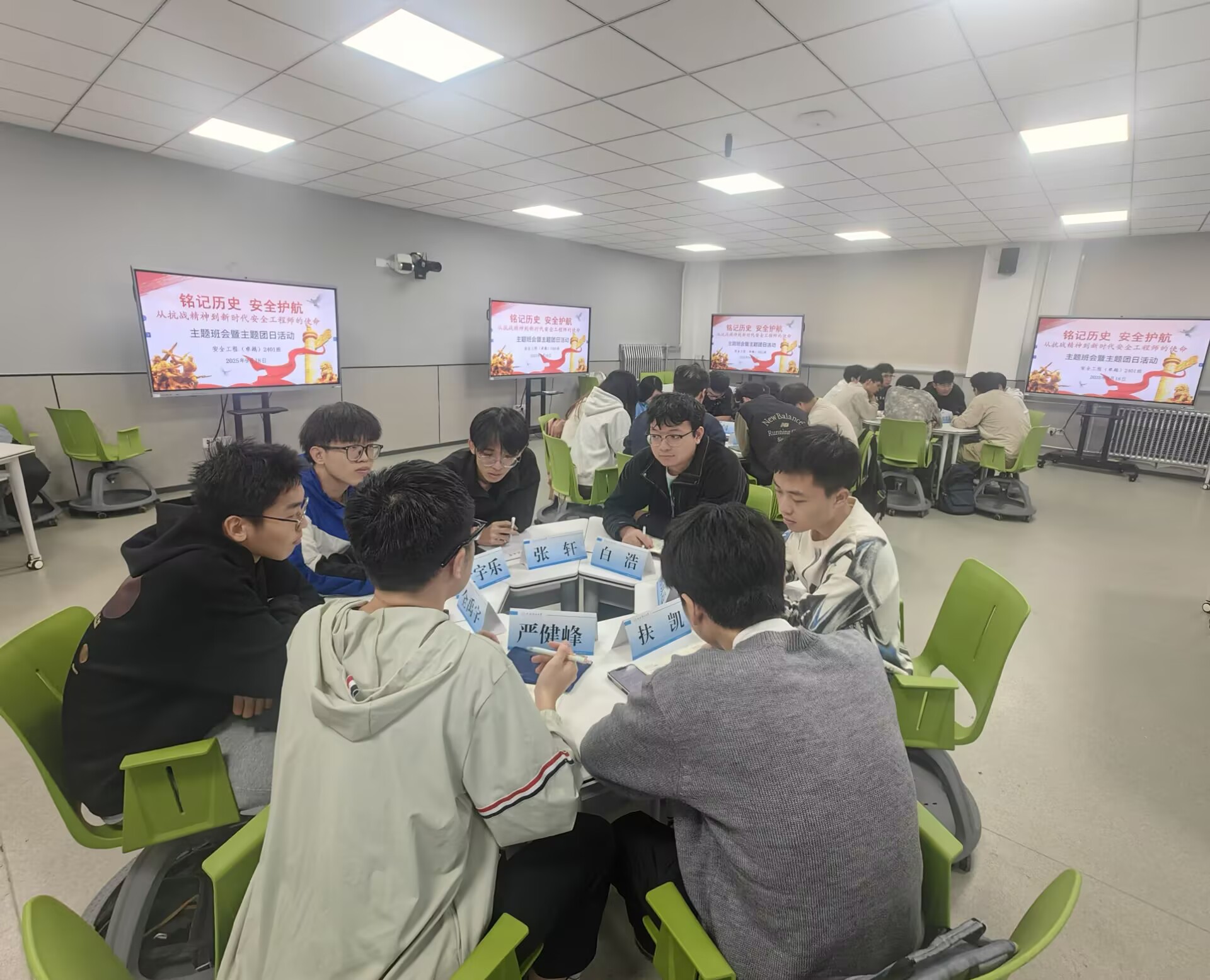 9月18日,3 号教学楼 203教室里气氛庄重而热烈,安全工程(卓越)2401 班举行 “铭记历史 安全护航 —— 从抗战精神到新时代安全工程师的使命” 主题班会暨主题团日活动。学术班主任邓军、班主任刘文刚、辅导员曹月,以及该班全体同学齐聚一堂,共同回溯历史、研讨专业、展望未来。