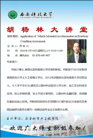 于2022年1月14日,以线上讲座形式举办了“胡杨林大讲堂”,本次报告特邀美国北亚利桑那大学终身职教授何俊兴博士,做了题为“Application of Vehicle Mounted Accelerators in Roadway Condition Assessments”(车载加速器在道路状况评估中的应用)的学术报告(双语报告)