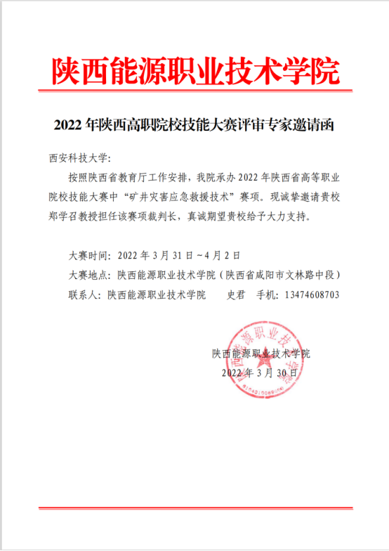 承办的“2022年陕西省高等职业院校技能大赛”在咸阳举行。本次大赛共设置“矿井灾害应急救援技术”、“电子商务技能”、“光电技术”等126项赛项,是我省高等职业院校的重大比赛活动之一。