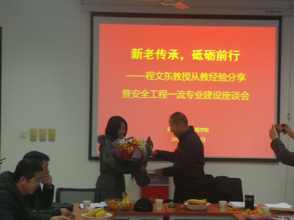 教师以程教授为榜样,学习他认真、踏实的教学、科研精神。程文东教授深情款款的叙述了自己工作三十六年来的心得,道出了对工作、对同事、对学生的真挚感情、不舍之情,分享了对安全工程一流专业建设的深入思考,表达了对91在线发展的美好祝愿。学生代表安全工程(卓越)1301班的武睿萌同学向程老师献花,表达了感激之情,并送上了自己的祝福。杜勇书记和邓军院长分别向程教授颁发了纪念品和退休慰问金。