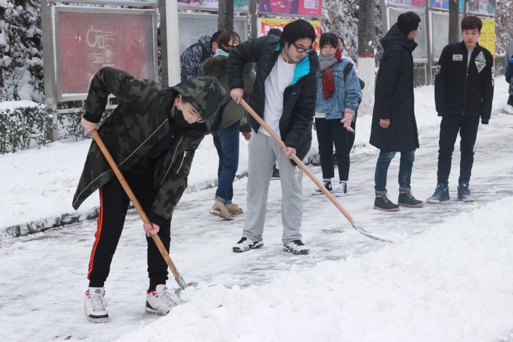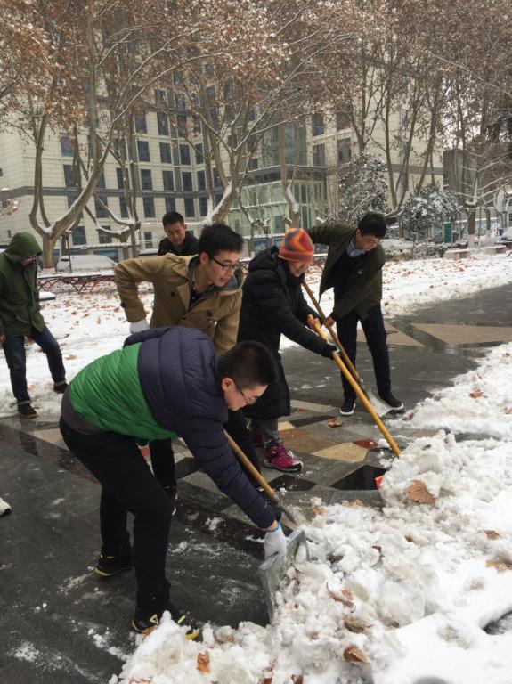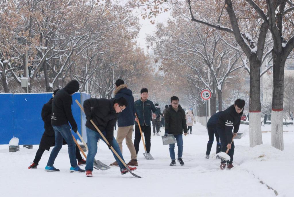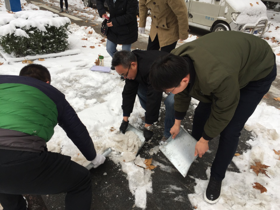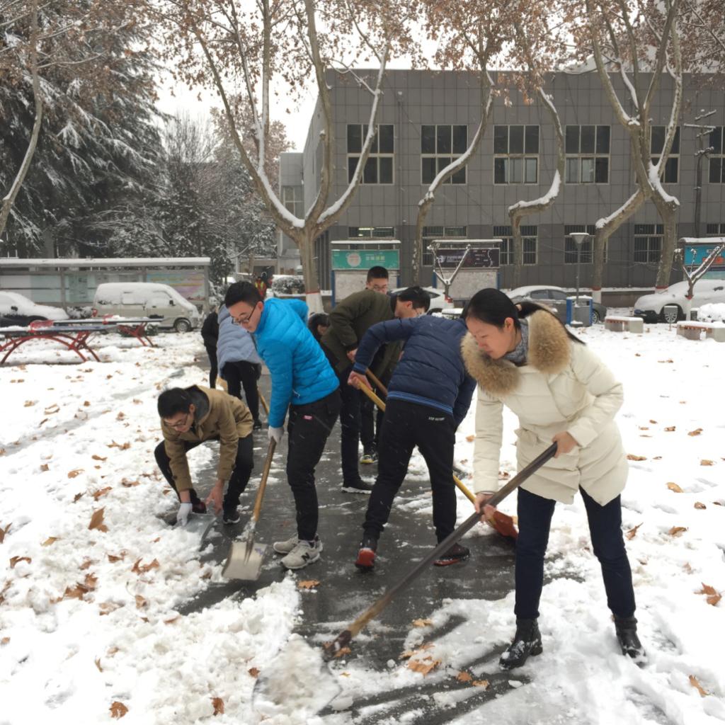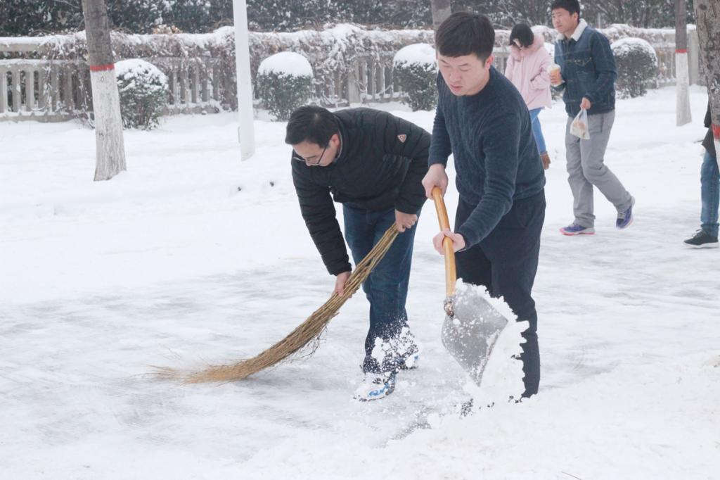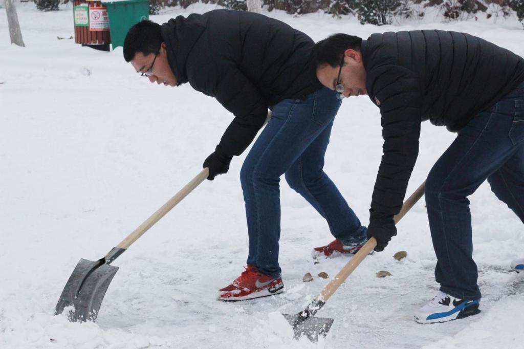 研究生党员和积极分子在党委书记杜勇、副书记田园以及辅导员王倩的带领下对卫生责任区以及主干道上的积雪进行了清理。