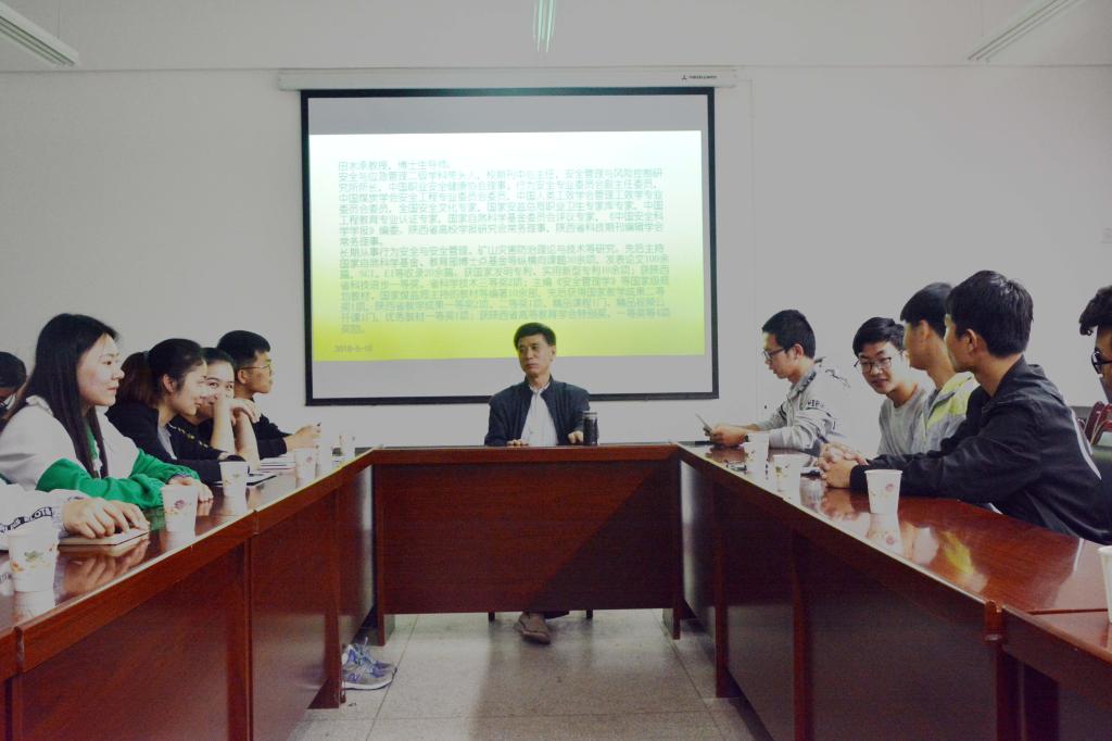 田教授首先向同学们介绍了安全生产“五要素”,推荐了《安全管理学》等专业书籍。田教授带领同学们简单的了解了“一通三防”并给大家强调煤矿安全生产事项。他说道,煤矿的生产安全,技术条件要合格,并且管理制度也要健全完备,这样才能尽可能杜绝重特大事故的发生,达到保护工作人员生命安全的目的。