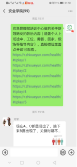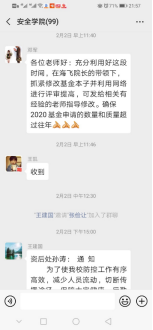 积极开展疫情防范安全知识宣贯,例如转发应急管理部培训中心有关上班途中、工位、用餐、回家、锻炼方面的指导视频,“75%酒精可有效消毒,但请务必远离明火”等安全知识;积极协助地方应急管理局为企业复工开工后疫情防治方案提出建议;号召教师利用假期加强科研投入、修改国家基金;积极督促研究生开展线上学习与科研交流活动,利用网络手段开展线上视频会议,指导研究生开展文献综述、科研论文、论文开题、学位论文等撰写或修改工作,为开学后研究生开题、预答辩和科学研究打下基础。