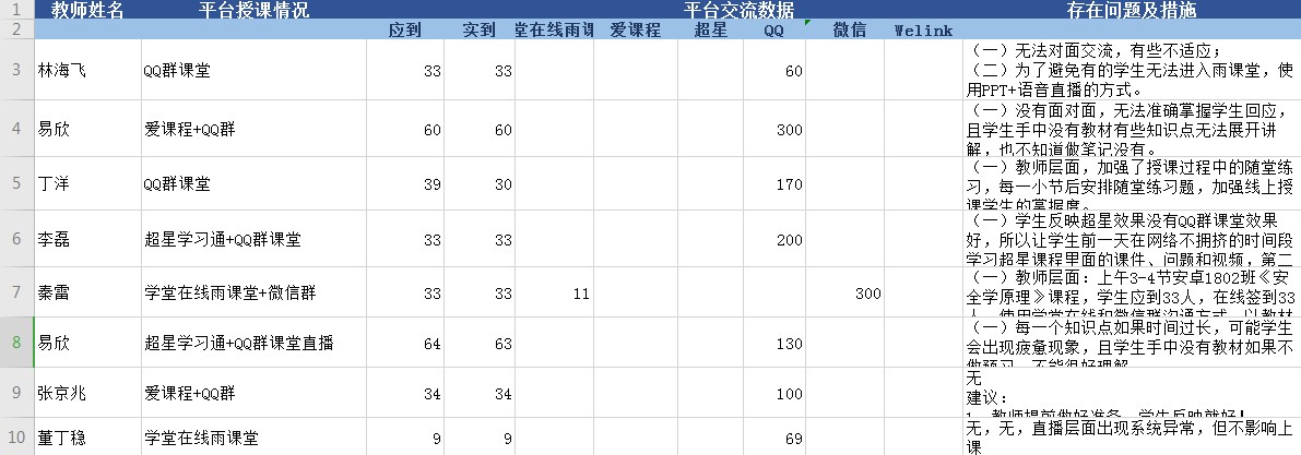 领导班子、院级教学督导专家、教务办主任以及各系主任等为主体的线上教学督导小组,采用“教学教案课前督查”、“授课效果过程督查”以及“课后答疑反馈督查”等方式,对前8周开课的52门本科课程进行了100%全覆盖的线上课程听课、巡课督查,确保教师授课热情饱满,学生积极互动,教学运转整体良好。