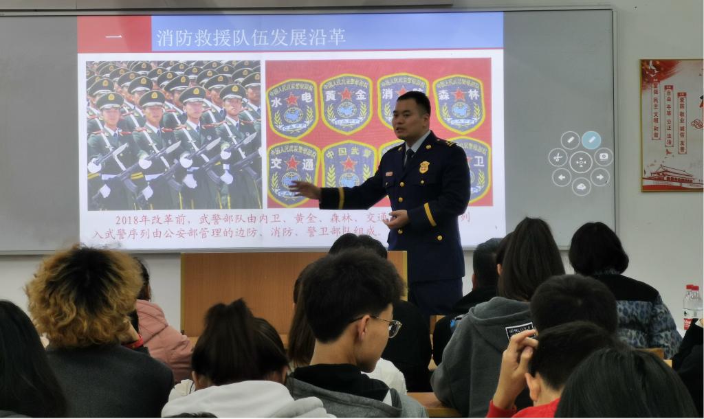 训练部参谋贺松指挥员为消防救援系同学做题为“国家综合性消防救援队伍人才培养发展展望”的专业报告,报告会由消防救援系副主任赵婧昱主持。