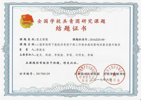 深入挖掘“精彩精神”的育人功能,寻找理论实践契合点,形成“精彩精神”融入大学生使命教育研究方向,发挥课题研究智库引擎作用。获批全国学校共青团研究重点课题、陕西高校学生工作研究课题、陕西省高等教育学会疫情防控专项研究课题、陕西省教育厅科研计划项目等省级以上课题4项,校级课题5项。研究成果获全国学校共青团优秀研究成果一等奖、全国学校共青团优秀论文三等奖1项,校级成果奖3项。