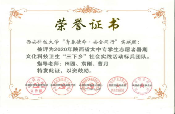 “青春使命·安全同行”实践团获批2019年全国百强实践团队,获2019、2021年陕西省优秀团队、2020年陕西省标兵团队;获陕西高校“万名学子扶千村”社会实践脱贫攻坚专项活动三等奖。志愿服务项目获陕西省青少年公益项目大赛三等奖;学生作品获“挑战杯”红色专项赛全国三等奖1项、省级一等奖、三等奖各1项;获陕西高校心理剧比赛一等奖、三等奖各1项。开展的相关活动被新华网、光明网、中国青年网、陕西省教育厅、云南电视台、陕西新闻网等媒体报道。