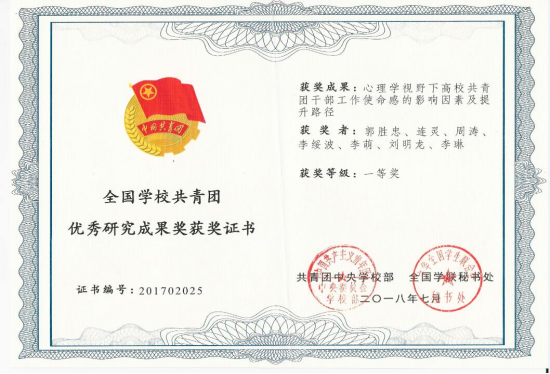 全国学校共青团优秀研究成果一等奖