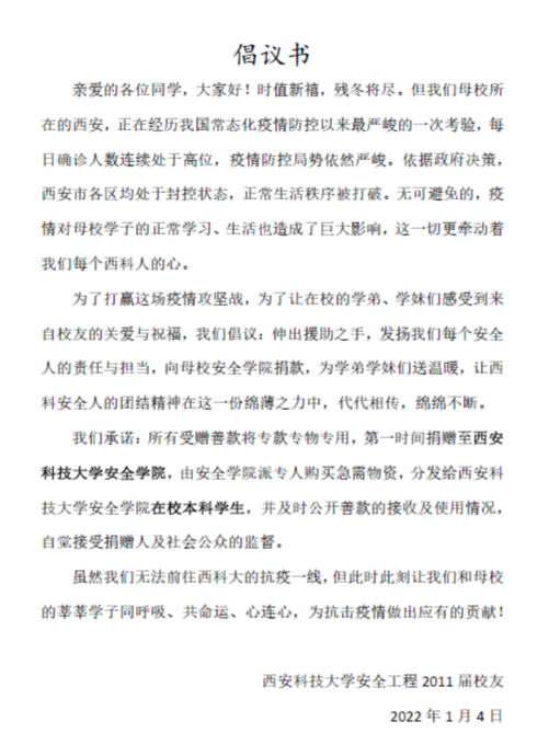 安全工程2011届校友情系母校,自发组织在年级微信群里发出“伸出援助之手,发扬我们每个安全人的责任与担当,向母校91在线