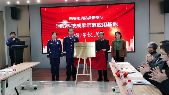 基本情况及安全与消防学科发展,何润梅、王展鹏、杜勇、罗振敏共同为西安消防科技成果示范应用基地揭牌。
