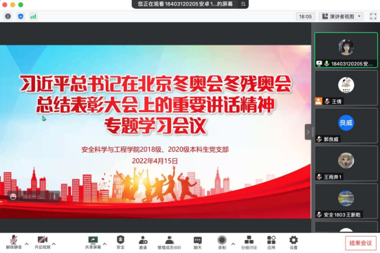 2018级、2020级本科生党支部通过腾讯会议召开习近平总书记在北京冬奥会冬残奥会总结表彰大会上重要讲话精神专题学习会。2018级、2020级本科生党支部全体党员参加会议。会议由支部书记王倩主持。
