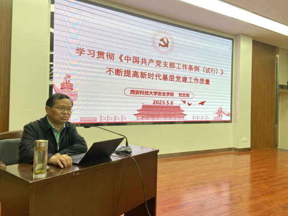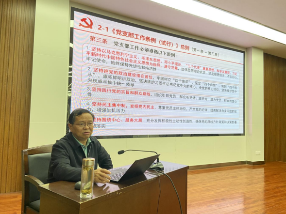 党委书记刘文刚以“学习贯彻《中国共产党支部工作条例(试行)》,不断提高新时代基层党建工作质量”为题,从党的二十大报告中关于全面从严治党的重要部署入手,详细解读了《中国共产党支部工作条例(试行)》和《关于高校党组织“对标争先”建设计划的实施意见》,有针对性地提出了不断提高基层党建工作质量的路径,并就党支部开展学习贯彻习近平新时代中国特色社会主义思想主题教育进行再动员再部署。